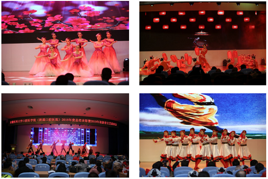 伴随着主持人的闪亮登场,2019年迎新春文艺联欢会正式开始。《大红灯笼高高挂》吉祥喜庆,舞姿优美;乐舞《草原新牧民》将太极、二胡和舞蹈融为一体,令人耳目一新;《草原女民兵》舞姿翩翩,英姿飒爽。小品类节目时而令人动容、落泪,时而幽默搞笑,令人捧腹大笑;歌曲类节目声音清澈,悠扬婉转;激情澎湃的诗朗诵诠释了浓浓的爱国之情,展现了口腔人积极进取,奋发图强的精神风貌,精彩的节目高潮迭起。现场抽奖环节,氛围热烈,让人目不暇接。联欢会在《不忘初心》绚丽多姿的舞步中完美落幕。