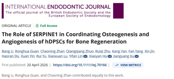 近日,澳门银河娱乐 徐建光副教授、胡晓燕副教授联合香港大学牙学院林倚帆副教授在口腔再生医学领域取得重要研究进展,研究成果发表于牙体牙髓病学顶刊 International Endodontic Journal(一区,Top,IF=7.1,澳门银河娱乐-银河娱乐集团 高水平期刊T1)。论文题为《The Role of SERPINE1 in Coordinating Osteogenesis and Angiogenesis of hDPSCs for Bone Regeneration》,论文第一作者为李邦副教授、硕士研究生管荣华、博士研究生詹朝宁,通讯作者为徐建光副教授、胡晓燕副教授、林倚帆副教授。安徽医科大学口腔医学院为第一完成和通讯作者单位。