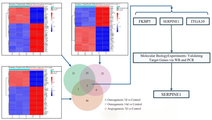 研究团队以人废弃牙齿来源的牙髓干细胞为研究对象,通过时序转录组学分析,筛选出在成骨分化和成血管分化过程中均显著上调的关键分子—SERPINE1。进一步功能实验表明,SERPINE1能够同时促进牙髓干细胞的成骨分化和血管生成相关能力提升。一方面,它可增强碱性磷酸酶活性和矿化结节形成,上调RUNX2、COL-1、OPN等成骨相关指标;另一方面,它还能提高VEGFR2、CD31等血管生成标志物表达,并增强内皮细胞成管能力。研究提示,SERPINE1是连接“成骨”与“成血管”两大再生过程的重要调控枢纽,为骨组织再生中“骨-血管耦联”机制提供了新的理论依据。
