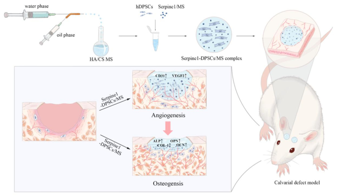 并且在此基础上,团队进一步构建了负载SERPINE1的羟基磷灰石/壳聚糖微球递送体系,并将其与牙髓干细胞结合,应用于骨缺损修复研究。实验结果显示,该体系具有良好的生物相容性和可控释放性能,能够在局部持续释放SERPINE1,充分发挥促成骨、促成血管的双重作用。在大鼠颅骨临界性骨缺损模型中,SERPINE1-DPSCs/MS组较对照组表现出更显著的新骨形成和血管化修复效果,在骨体积分数、骨小梁厚度及微血管密度等指标上均明显改善,展现出良好的临床转化前景。(正畸科 李邦)
