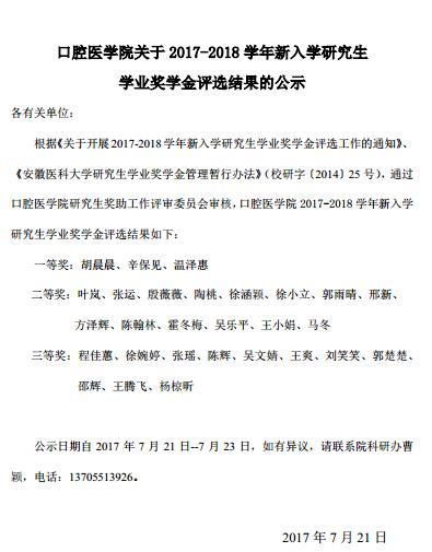 2017-2018学年新入学研究生学业奖学金评选结果公示